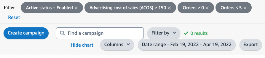 2nd Filter - Active Campaigns | ACOS > 150% | Orders > 0 | Orders <5 | Data Range - Select Manually Last 60 days