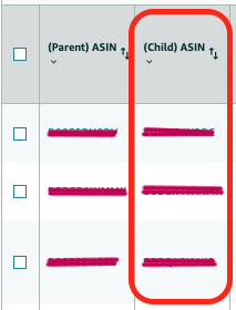 ASIN SELF:Use all of the ASINs from the (Child) ASIN column from “Detail Page Sales and Traffic By Child Item” on the Business Report. See the (Child) ASIN column below the image: