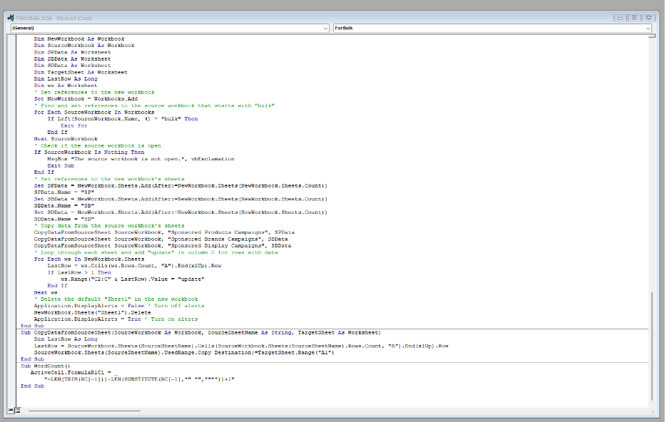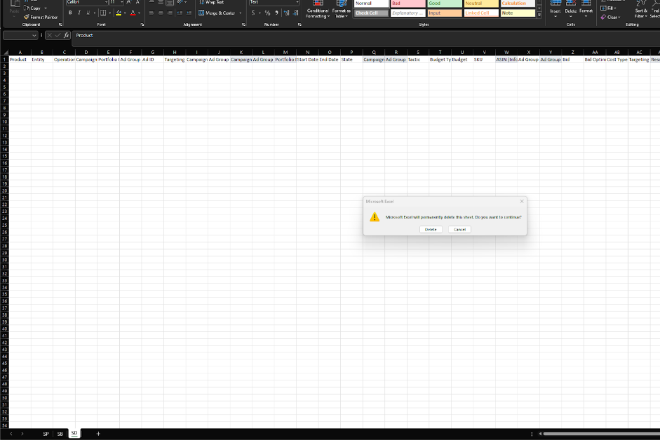 The objective of this SOP is to guide users through a series of steps to enhance their Amazon advertising workflow. Specifically, it aims to automate the process of filtering, sorting, and adding new columns to a bulk file containing data related to Sponsored Products (SP), Sponsored Brands (SB), and Sponsored Display (SD) campaigns. The provided macros facilitate these tasks, ensuring efficiency and accuracy in campaign management.