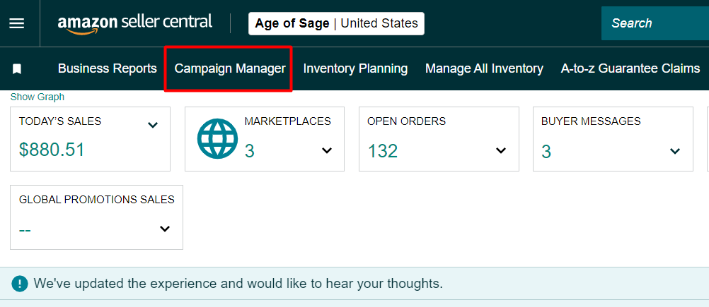 Step 1: To download an Advertising Invoice, On your Seller Central Home Page click the "Campaign Manager" tab