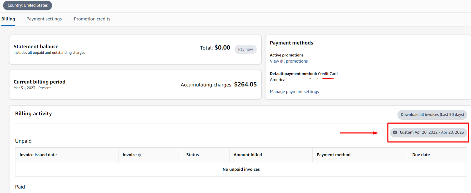 Billing Activity will show you a table of your advertising invoices sorted from the most recent to the oldest. If you want to change the date range or period for the invoice you are looking for, click on the "Custom" button located at the top right of the table.