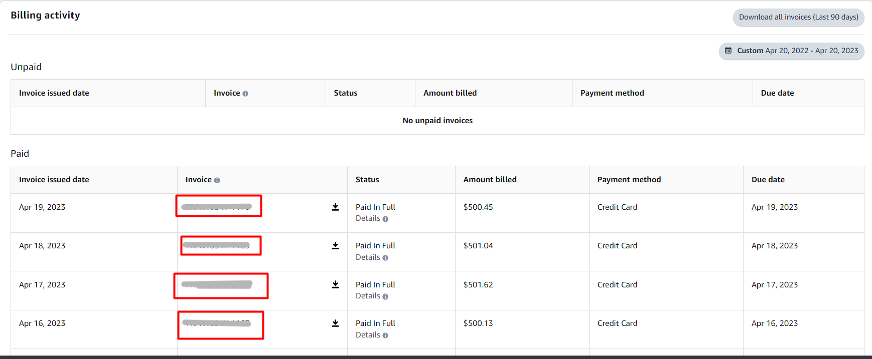 Step 4: Download the advertising invoice. To download the invoice, click on the download icon located to the right of the invoice number. Once you download the file, you will receive a detailed PDF copy of your Sponsored Ads Invoice.