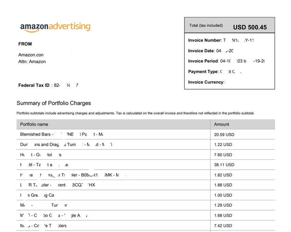 Once you click the invoice number you will be directed to a page that shows a detailed breakdown of your advertising invoice. This will show you the advertising charge for each portfolio and also for each campaign.