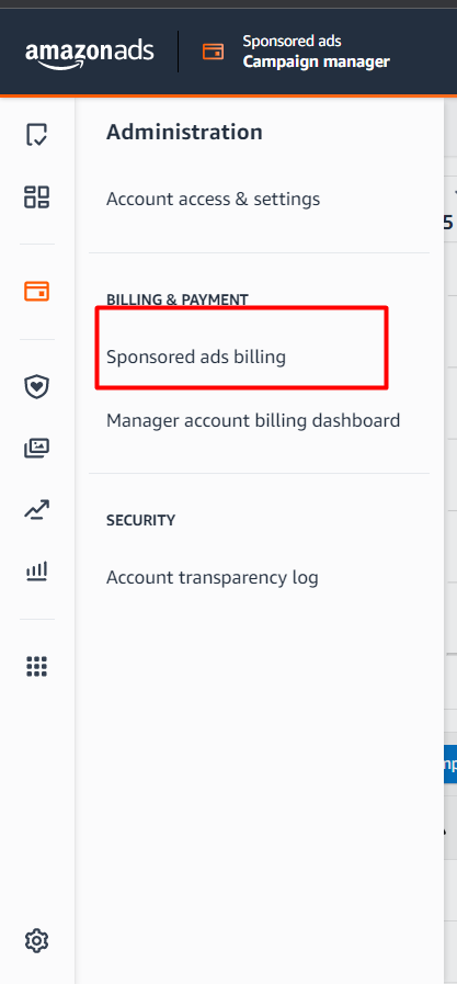 Step 2: Once you are on the Campaign Manager click the "Administration" icon and select "Sponsored Ads Billing"