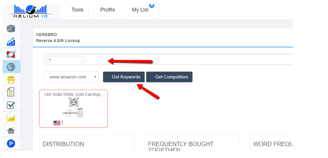 8. Go to Helium10, enter the ASIN of the products you checked (one at a time) and click on Get Keywords