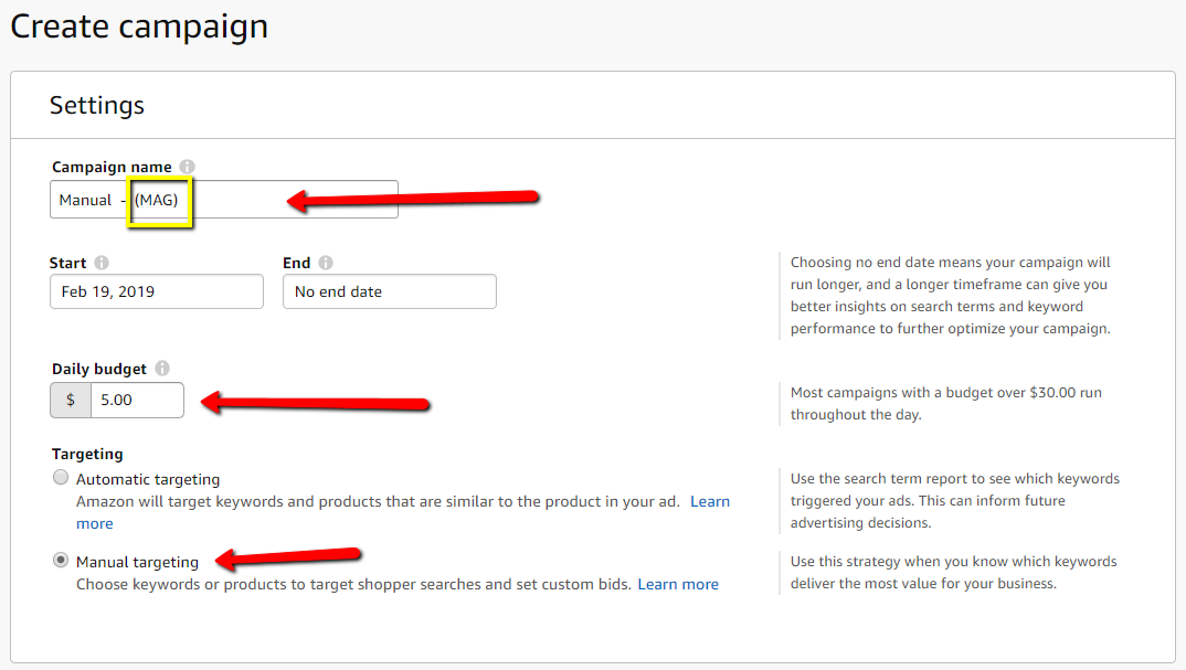 7. Create Campaign name, set Daily budget to how much the seller budget is and choose Manual Targeting