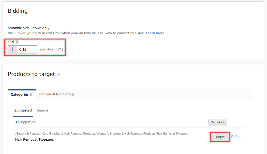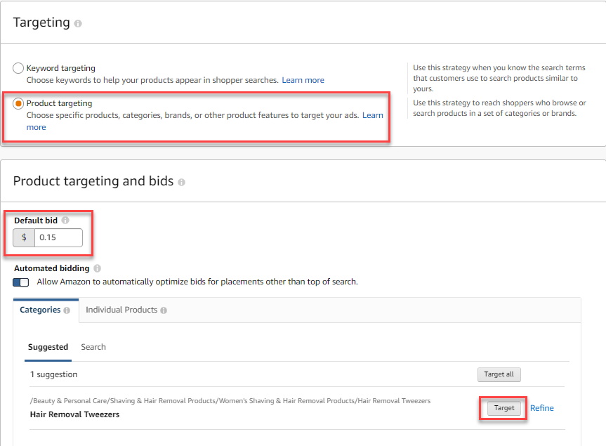 6. Select Product targeting, set the default bid to between $0.15-$0.25 and select the applicable category by clicking Target. Then finish by clicking on Submit for Review.