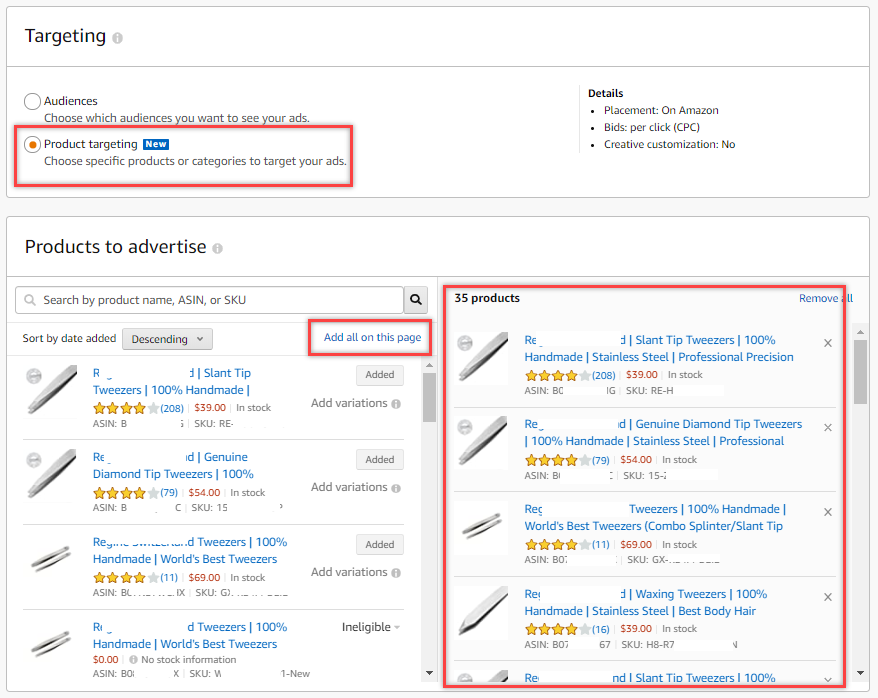 3. Select Product Targeting then click Add all on this page (make sure you click this on all pages to select all product in the catalog).