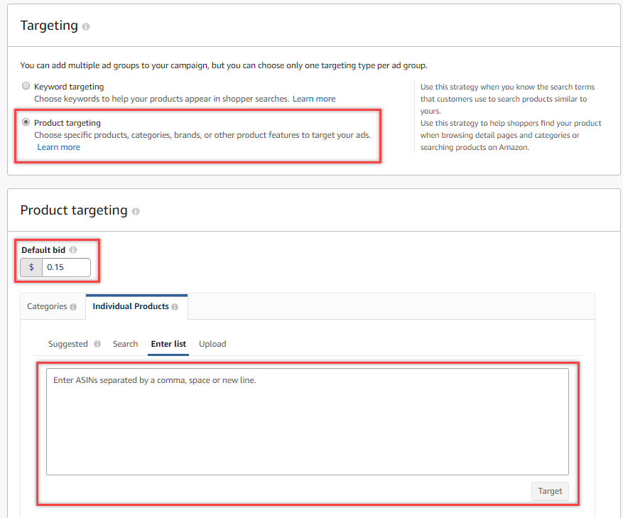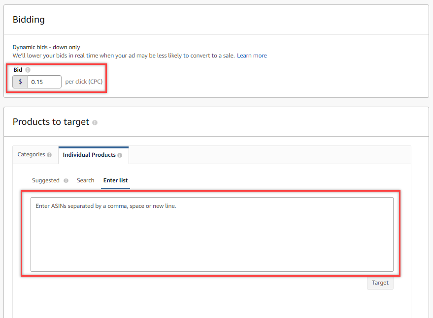 5. Set the bid to $0.15 and click on Individual products and Enter List. In the box, add each of the ASIN from the catalog. Then finish by clicking Launch Campaign.