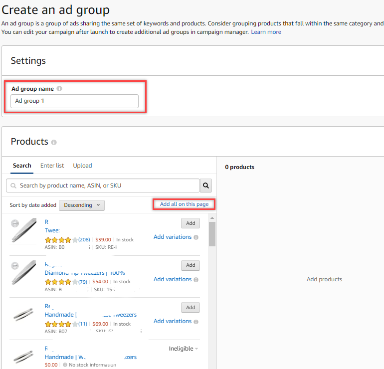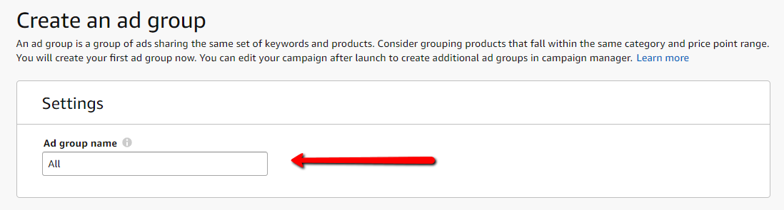 1. Create an Ad Group, set group name according to the product