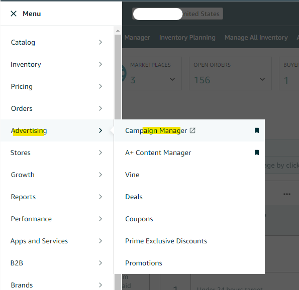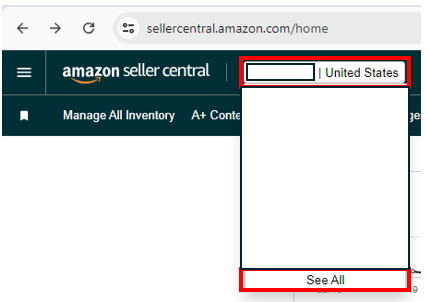 1. Log in to Seller Central. Go to the marketplace switcher and choose the account where you will set up the ad campaign