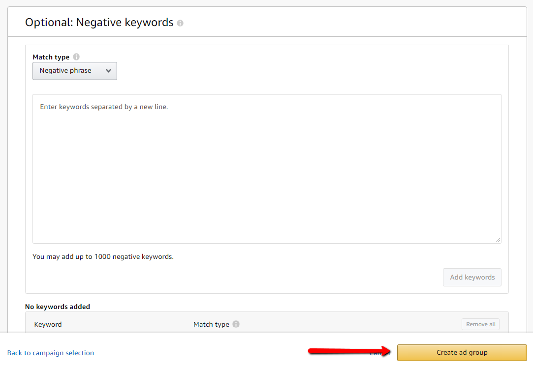 7. No need to put anything on Negative Keywords and click on Launch Campaign/Create Ad Group
