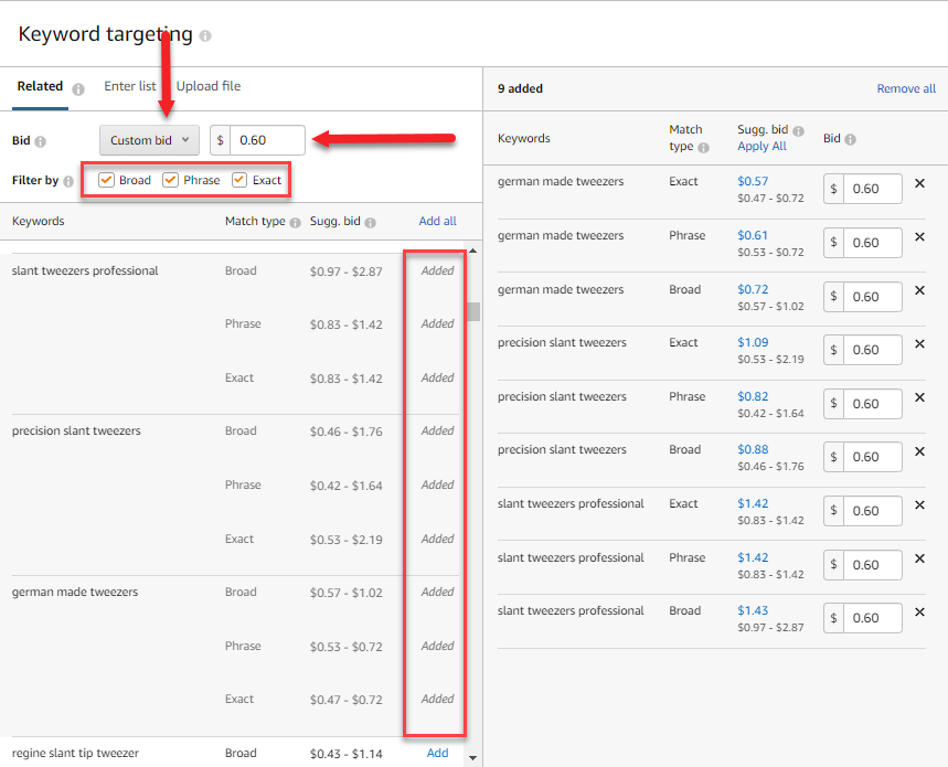 11. Copy and paste the Top 5 keywords into the “Enter List” section back in the campaign creator. Make sure each of the match types is selected. Use the same calculated bid for the “Custom Bid”.