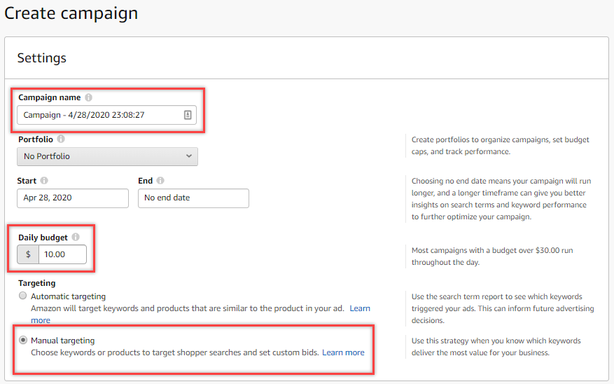 **Note: You will usually have to create 4 different campaigns (Manual, Brand, Competitor, and Automatic -- for Automatic campaigns, instead of choosing Manual Targeting, you will choose Automatic ). For the Daily budget, if the seller hasn’t provided it yet, put $10)