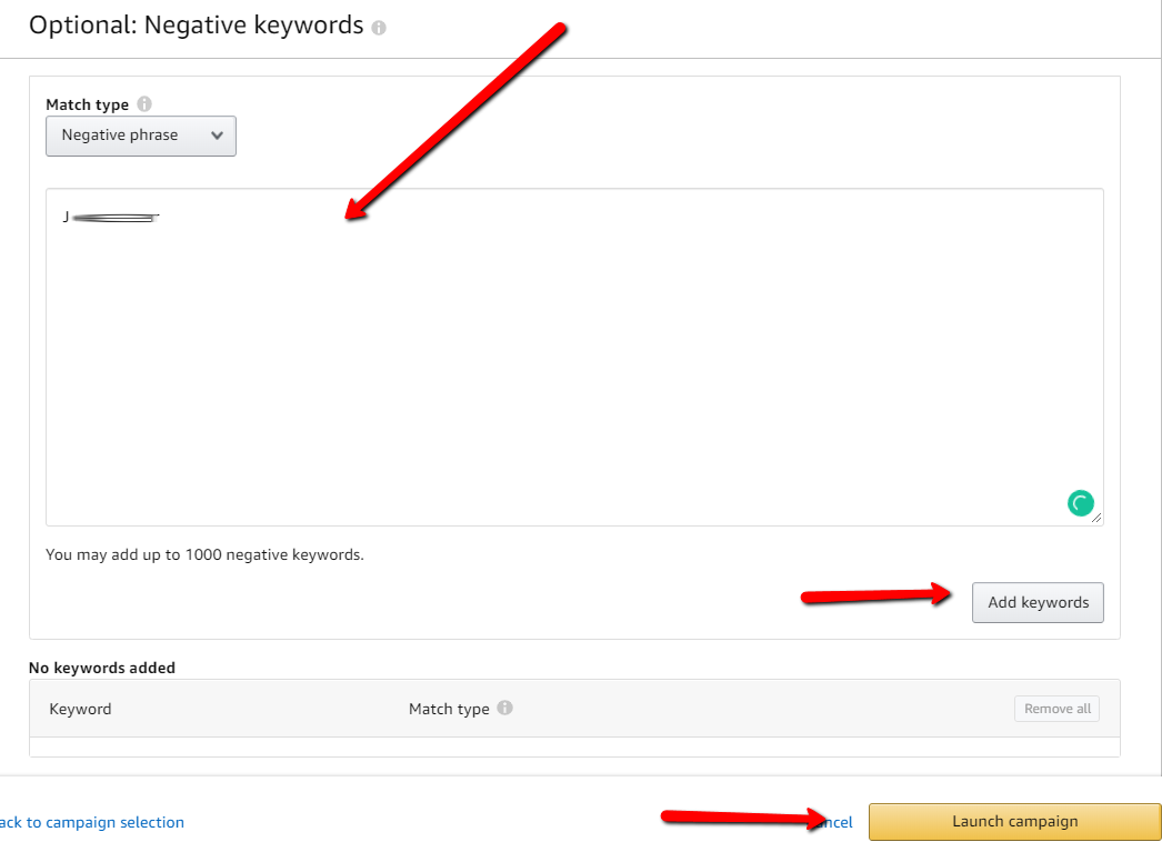 12. Put the brand name on the Negative Keywords for Automatic and Manual campaigns, add it and click on Launch Campaign/Create Ad Group