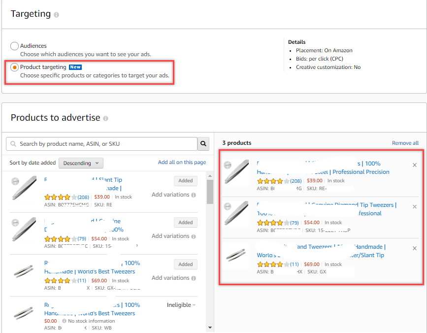 3. Choose Product Targeting and select the top three selling products.