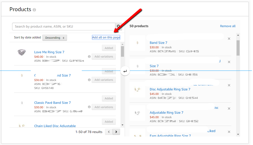 4. Name the ad group All Products and click on Add all on this page (make sure you click this on all pages to select all product in the catalog).