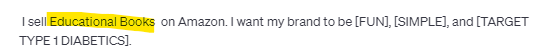 4. I sell [TYPE OF PRODUCTS] on Amazon. I want my brand to be [FUN], [SIMPLE], and [TARGET TYPE 1 DIABETICS].