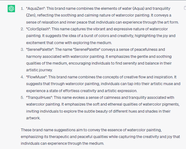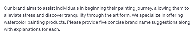 1. Our brand aims to assist individuals in beginning their painting journey, allowing them to alleviate stress and discover tranquility through the art form. We specialize in offering watercolor painting products. Please provide five concise brand name suggestions along with explanations for each.