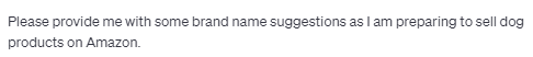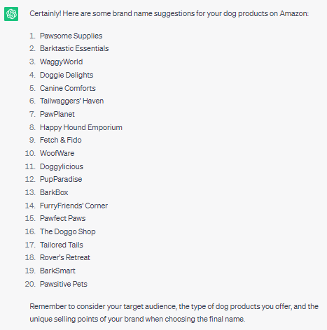5. Please provide me with some brand name suggestions as I am preparing to sell dog products on Amazon.