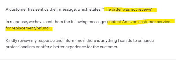 3. A customer has sent us their message, which states: (insert their message). In response, we have sent them the following message: (insert your message). Kindly review my response and inform me if there is anything I can do to enhance professionalism or offer a better experience for the customer.