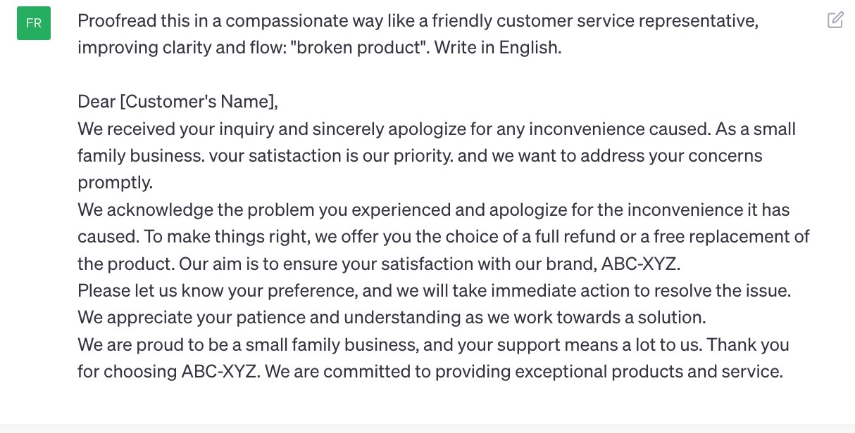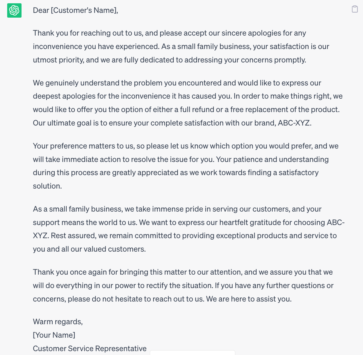 How to ask ChatGPT to deliver customer service prompts effectively. 1. Write a reply to my customer’s question: [QUESTION]