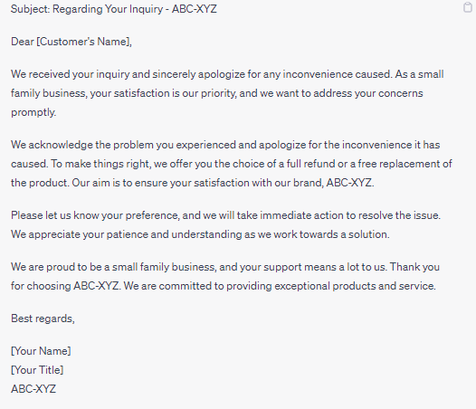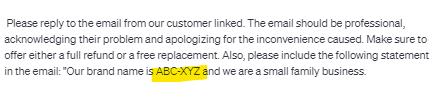 7. Please reply to the email from our customer linked. The email should be professional, acknowledging their problem and apologizing for the inconvenience caused. Make sure to offer either a full refund or a free replacement. Also, please include the following statement in the email: "Our brand name is <brand name> and we are a small family business.