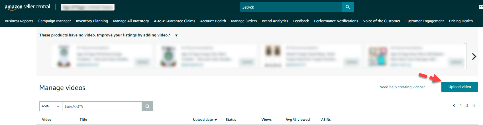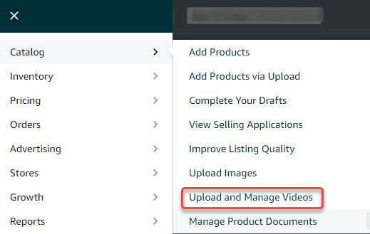 To access the "Upload and Manage Videos" function, select it from the "Catalog" tab Drop Down Menu on the top menu of Seller Central.