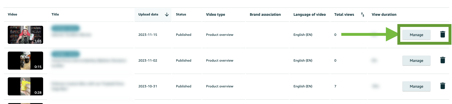 Select "Manage" or the Trash Bin icon next to the relevant video.