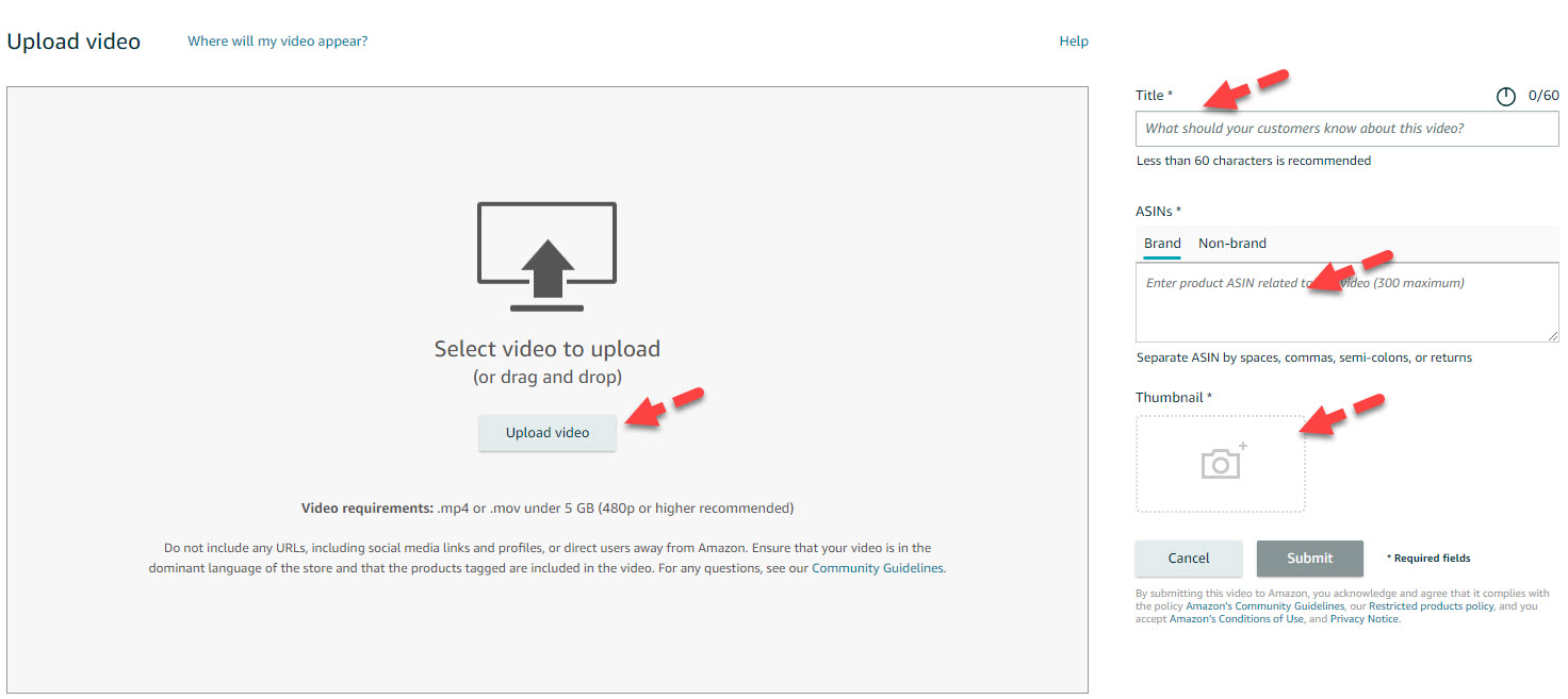 Once on the upload page, enter your video title, relevant ASINs, and upload your thumbnail, and upload your video.