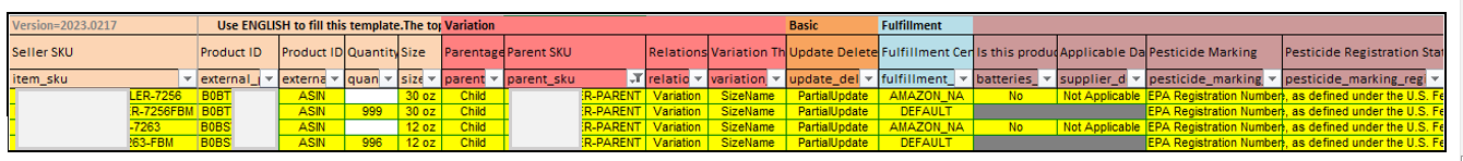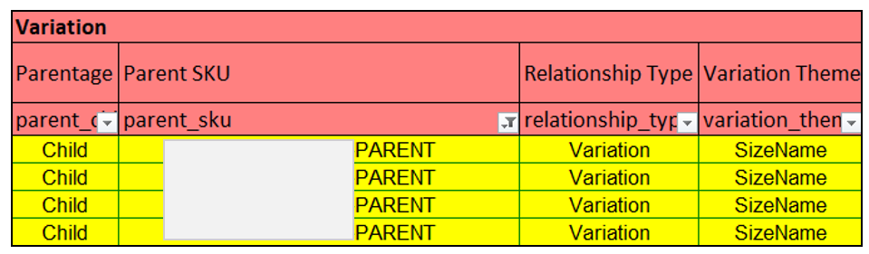 - Identify the variation name to be used for the parentage based on the variation theme that will be used. (SKUs with the same ASIN will have the same variation name).