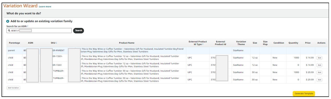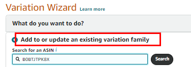 - Click the option “Add to or update an existing variation family” to search the ASIN.