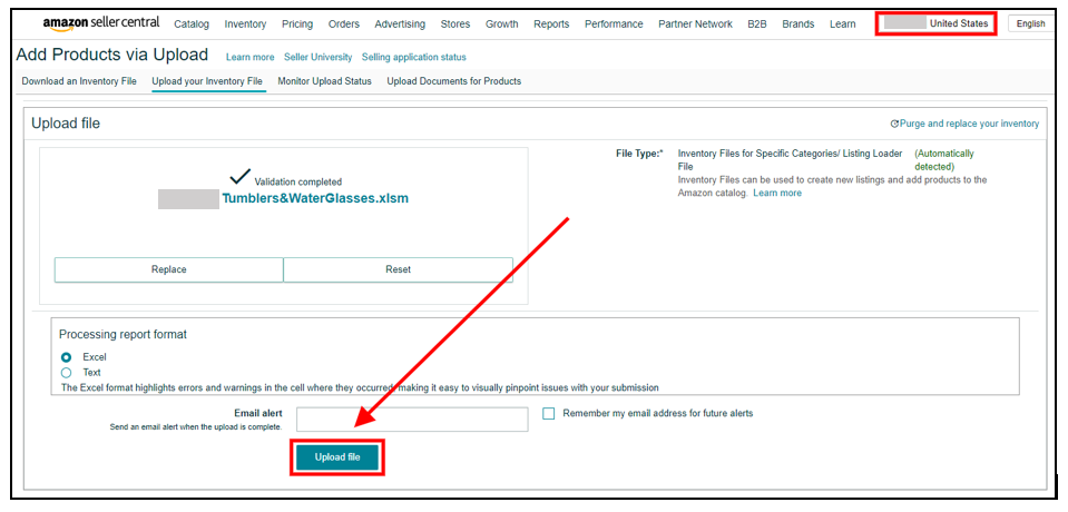 5. Save the flat file and upload it on Seller Central. Go to Inventory > Add Products via Upload > Upload your Inventory File. Refresh the page first before attaching the file and make sure you’re on the right Amazon store. Then click Upload file.