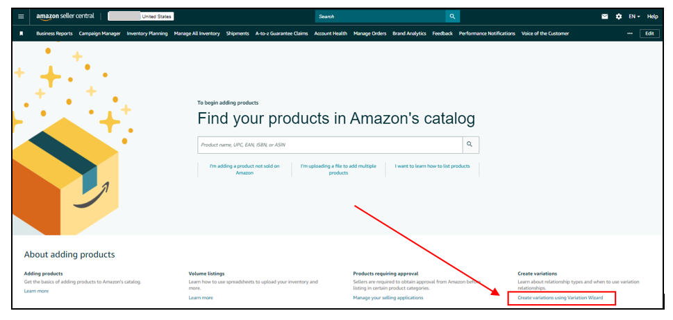 - Go to Seller Central > Inventory > Manage All Inventory and search for the parent SKU.