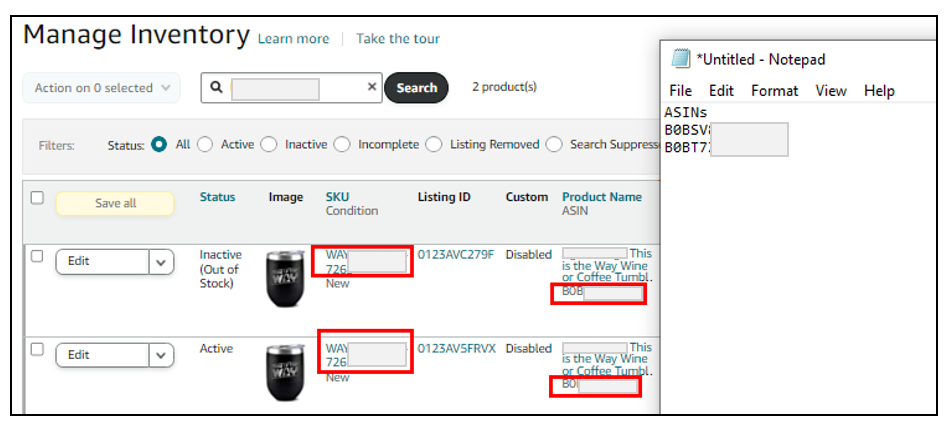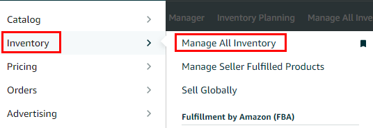 - Search for each one in the catalog and grab the SKU of each item under that ASIN (make sure that the “Status” and “Fulfilled by” are set to “All”).