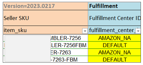 Under the Fulfillment Center ID, use AMAZON_NA (NA for North America, CA for Canada, MX for Mexico, etc) if it’s Fulfilled by Amazon and DEFAULT if it’s Fulfilled by Merchant.