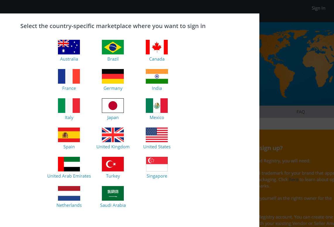 - Click sign in when on https://brandregistry.amazon.com/ and select your marketplace