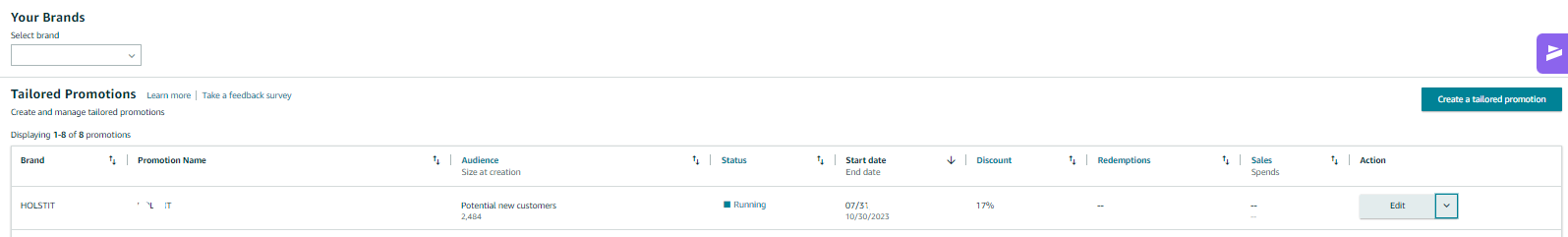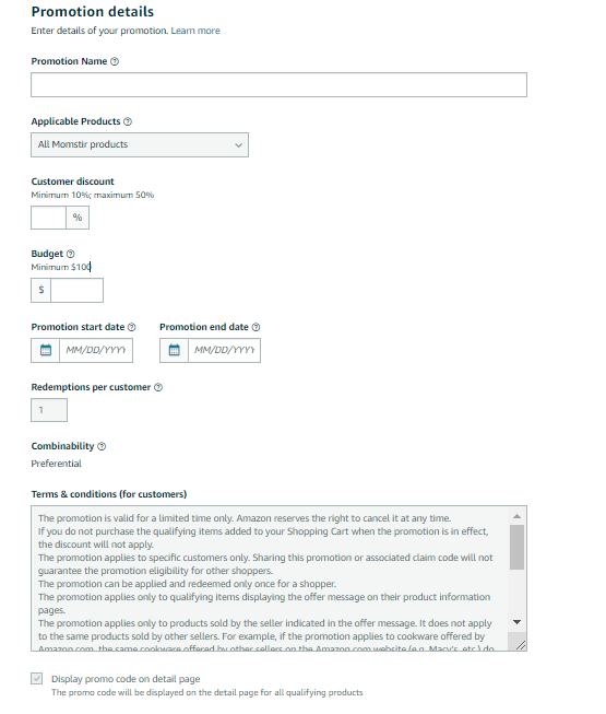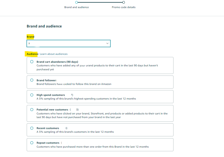 Note: The promotion will apply to the entire brand catalog for redemption on any one product per customer. The option to select specific ASINs eligible for the tailored promotion will be available in the future.