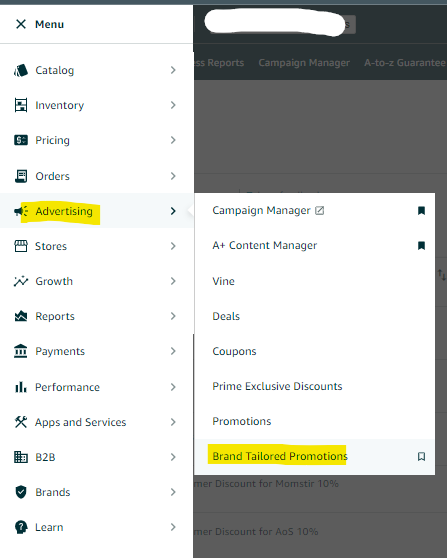 To learn more about Brand Tailored Promotions, see help link: https://sellercentral.amazon.com/help/hub/reference/GFM3F4GG5EYCC5XC