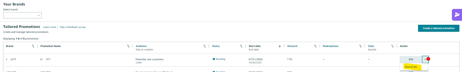 1. On the Brand Tailored promotion homepage, locate the active promotion you want to deactivate.