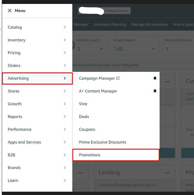 - Go to the "Advertising" tab on the top menu of Seller Central and select "Manage Promotions" from the drop-down menu.