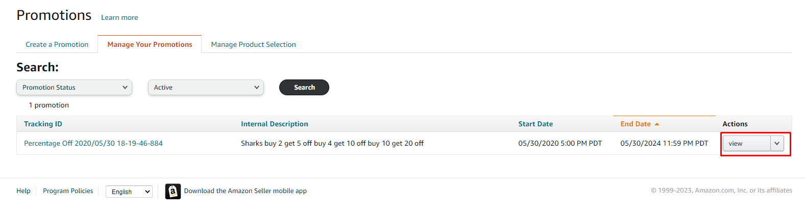 - Use the search option drop-down menus to locate your promotion under the "Manage your Promotions" tab