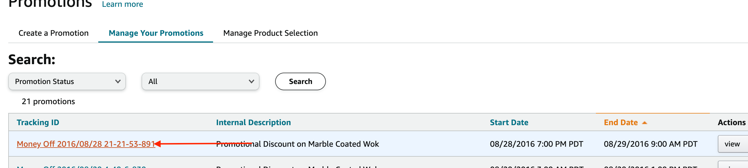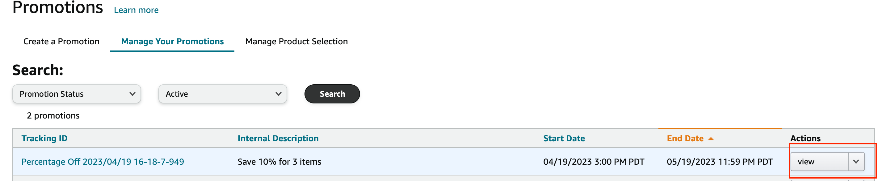 2. Under the "Manage Your Promotions" tab, use the search options at the top of the page to find your promotion.