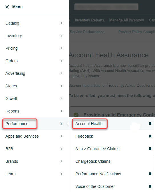 1. To review your Performance Metrics for Seller Fulfilled Prime, go to the "Performance" tab on the top menu of Seller Central and select "Account Health" from the drop-down menu.