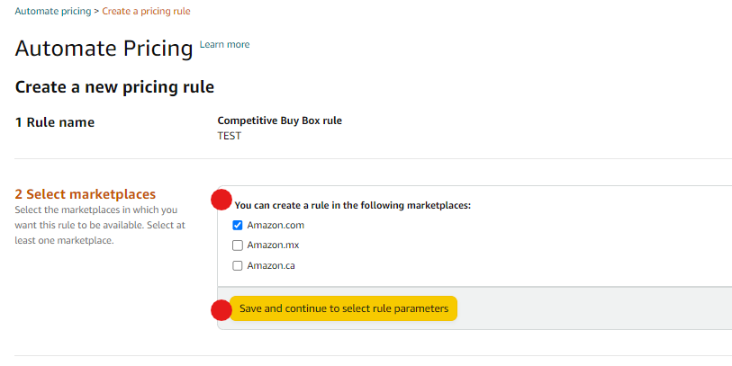 5. Select the marketplaces you want to create the rule for. Then click "Save and continue to select rule parameters" button.