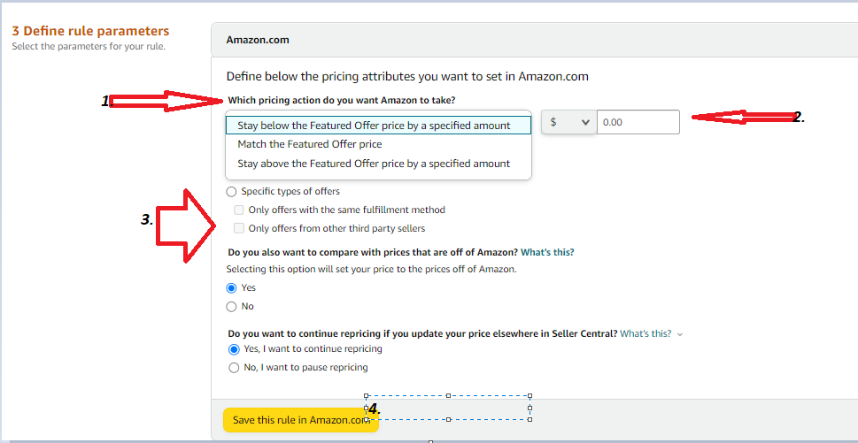 6. Define the price action you want Automate Pricing to take. Set the amount by which you want the automatic price action to trigger. Select filters for your rule to identify the types of offers you want to compare. Then, click "Save this rule".