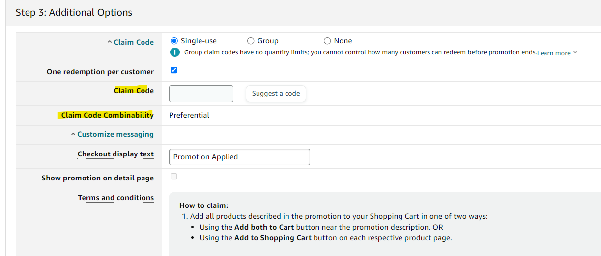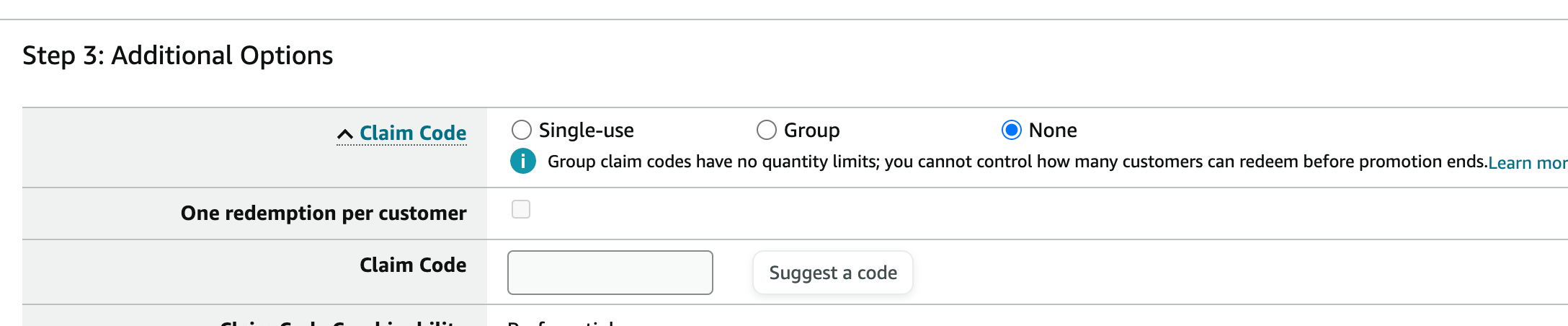 13. Under "Step 3: Additional Options", choose between "Single-Use", "Group", or "None" for the "Claim Code" option. Note the restrictions on using preferential and exclusive claim codes.