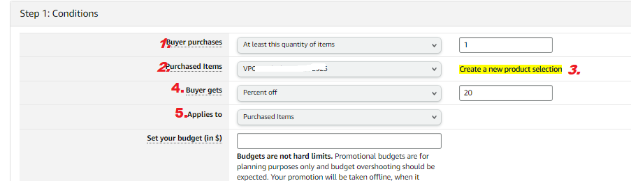 3. Under "Step 1: Conditions", select the required purchase quantity or value from the "Buyer Purchases" Drop-Down Menu and enter the corresponding number.4. Select the "Product Selection" from the "Purchased Items" Drop-Down Menu.