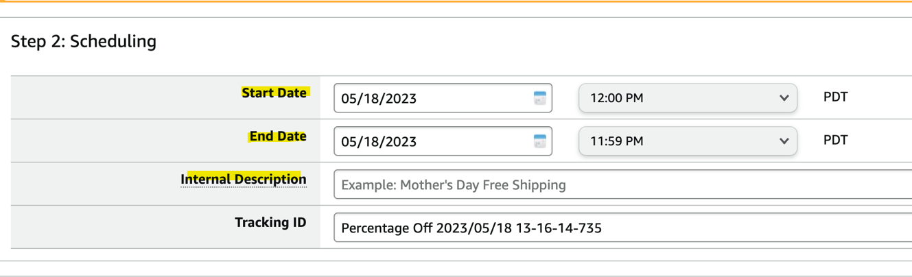 11. Under "Step 2: Scheduling", select the Start and End Dates and Times for the Promotion, keeping in mind that Amazon's default time is 4 hours ahead of PST to 11:59 pm PST.