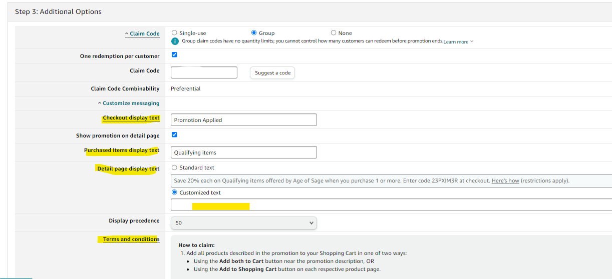 14. For "Single-Use" or "Group", select whether to allow one redemption per customer, enter your claim code, and choose the Claim Code Combinability as "Preferential" or "Unrestricted". For "Group", the Claim Code will be generated automatically by Amazon, but you can edit it.